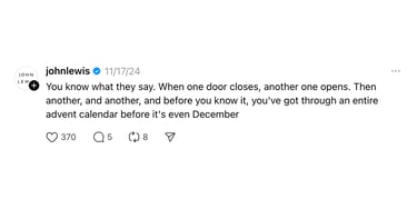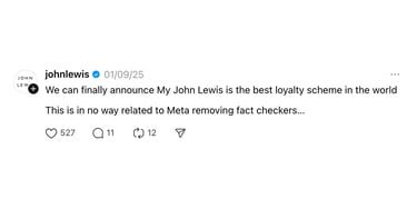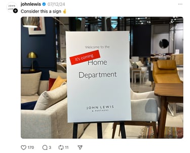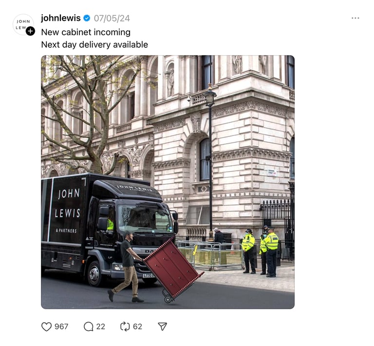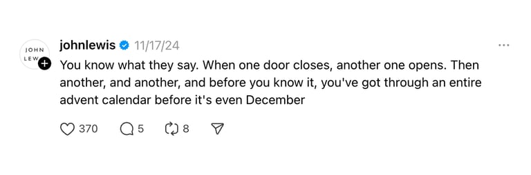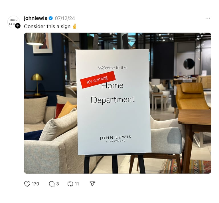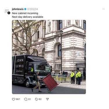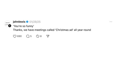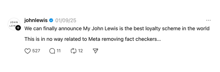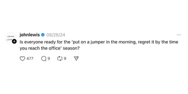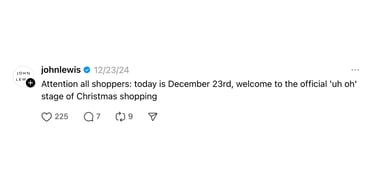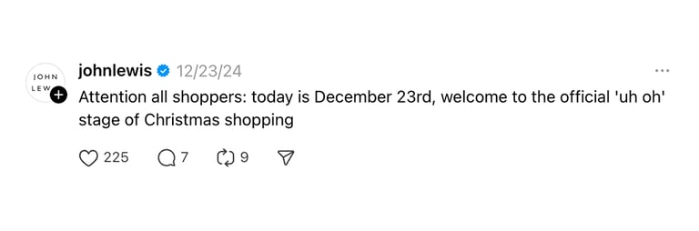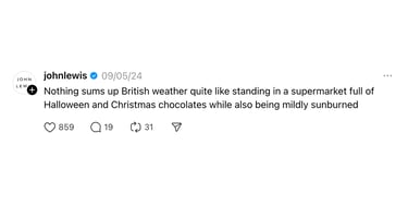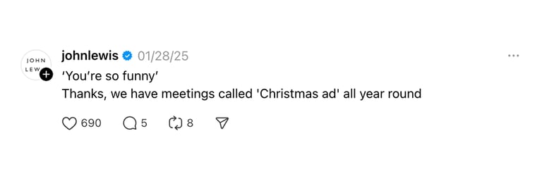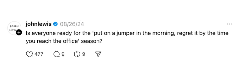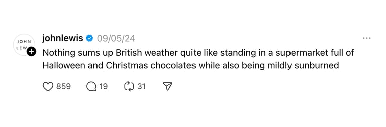 I co-wrote most content for John Lewis’ Threads and X accounts, which was posted almost daily. The brand was trying to reinvent itself while staying true to its British heritage, and this is reflected in the copy, which incorporates cultural moments, relatable insights and British humour.
